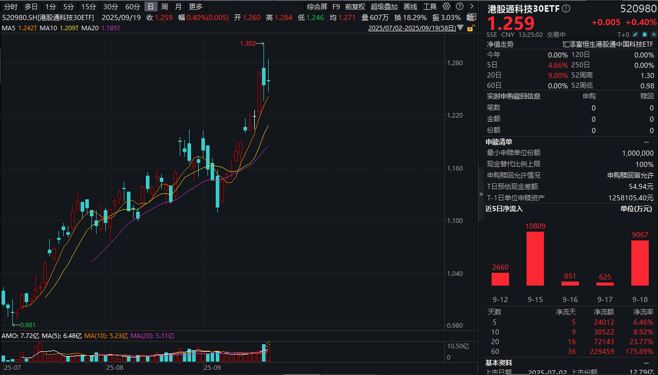 今日(9.19),受美降息利好,港股科技反攻继续,100%纯度的港股通科技30ETF(520980)一度涨2%,后冲高回落至0.4%,盘中成交额大幅放量至8亿元!资金面上,盘中持续溢价,目前溢价达0.39%,显示买盘旺盛,值得注意的是,昨日净流入超9000万元,已连续7日获资金青睐,最新规模超41亿元!