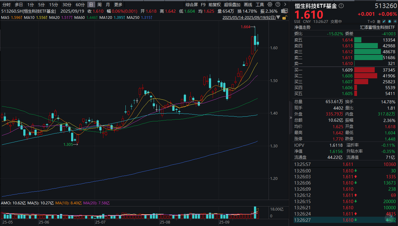 同类唯一15BP最低档管理费的恒生科技ETF基金(513260)涨0.06%,成交额已超11亿元,近10日累计“吸金”超5800万元,最新规模超71亿元!基金融资余额继续维持1.5亿元以上高位!