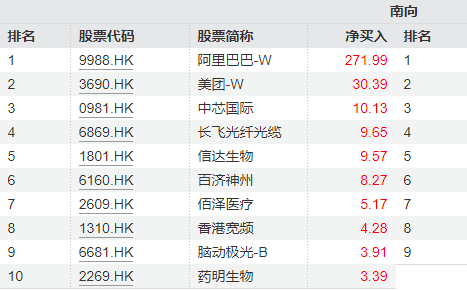 南向资金方面,近7日南向资金大举流入港股科技龙头,阿里巴巴以超271亿港元稳居净买入榜首,美团、中芯国际也位居南向资金近7日净买入第二和第三位。