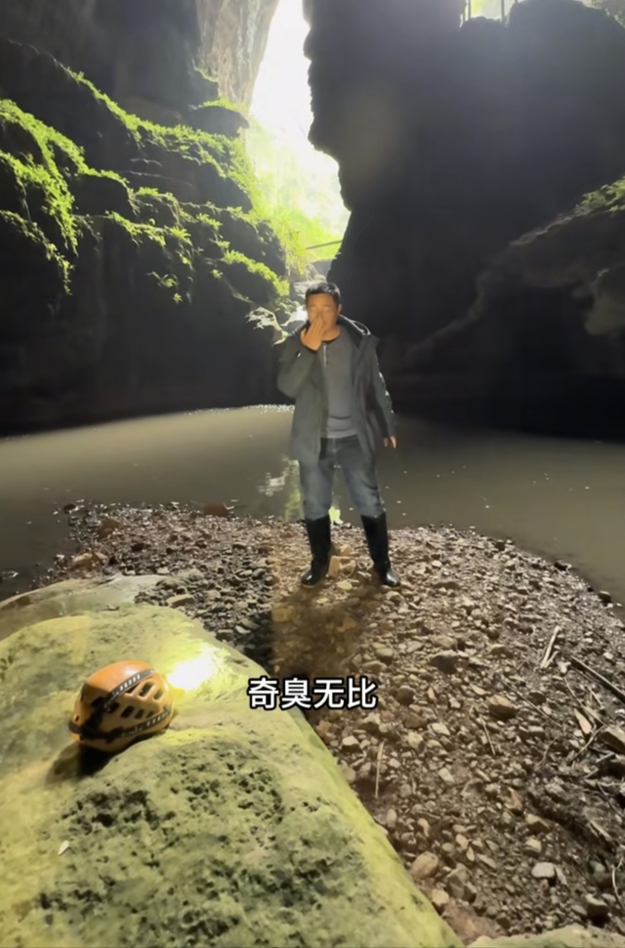 “我们把车停到路边,路旁的沟里全是猪粪,由于地势和沟渠走向,粪便就往天坑里面流。”“渔猎齐哥”介绍,连续两个溶洞,现场臭气熏天。“非常明显猪屎的味道,像来到猪圈一样,奇臭无比。灯一照,水全是黑的。”